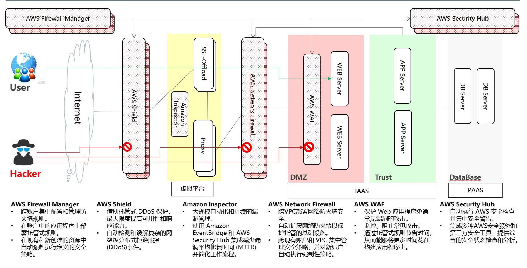 合众新能源需在AWS上部署多套系统,此处涉及到多个系统之间的安全架构规划和设计。此处碰到的挑战为需要全方位考虑云环境中的安全问题,从多个维度进行安全把控,包括安全措施的控制集成和协调、事件可追溯性和审计分析、AWS服务实施最低权限原则、自动化安全管理的最佳实践,及三方责任分担模型的实践和运用。汉得甄领目前已针对上述的难点设计了一套可普遍使用的系统安全架构,致力于为广大企业更好的服务。
